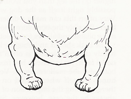 They are short, thick and heavy-boned. The bones of the forelegs are moderately bowed between the pastern and elbow. The broad chest, wide set forelegs and the closer rear legs all contribute to the correct rolling gait. The distance from the point of the shoulder to the tip of the withers is approximately equal to the distance from the point of the shoulder to the elbow. Shoulders are well laid back and fit smoothly onto the body. The elbows are always close to the body. Front feet are turned out slightly when standing or moving. The pasterns slope gently.These are correct front legs